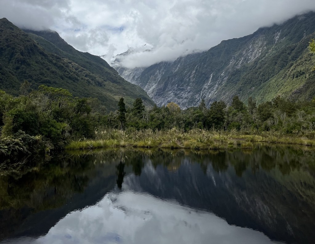As the Franz Josef glacier retreated, it left behind a large block of ice. This ice was surrounded by glacial moraine, as the ice melted it created a depression in the moraine which filled with water, forming this kettle lake. The pools lead to great pictures (especially on a clearer day!) as you can see the reflections of the mountains in it.
