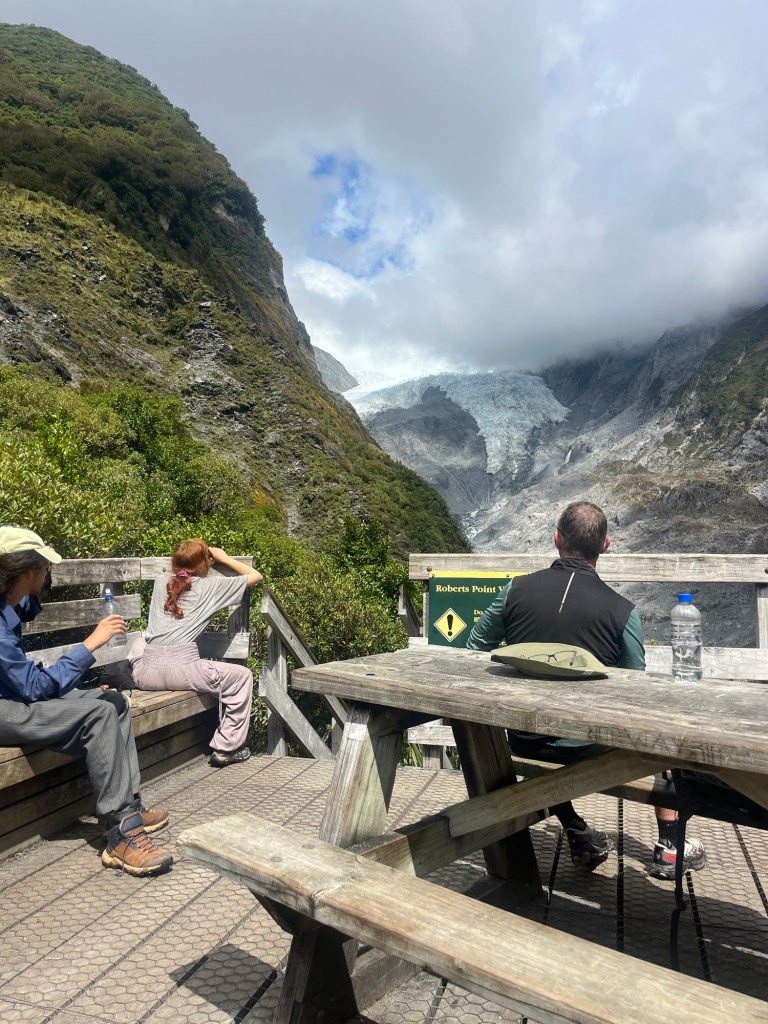 We ended up spending about 45 minutes at the viewpoint as we had a rest, ate our lunch and admired the glacier. We then got chatting to people and lost track of time a little bit, but it was a well-deserved break for sure! The lookout is a simple wooden structure with benches all around the edge and a picnic table in the middle.